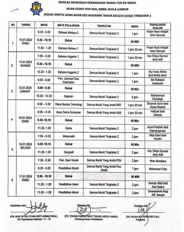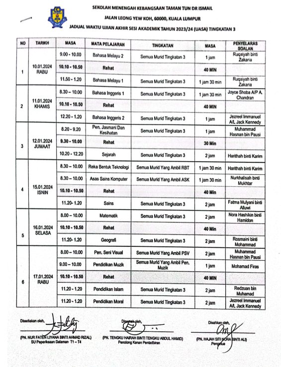 JADUAL UJIA AKHIR SESI AKADEMIK (UASA) T1, T2 & T3