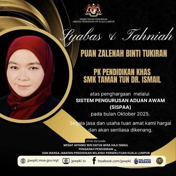 Syabas dan tahniah Puan Zalenah binti TukiranDecember 10, 2025Written by itc Leave a Comment Syabas dan tahniah diucapkan kepada Puan Zalenah binti Tukiran, PK Pendidikan Khas atas penghargaan melalui Sistem Pengurusan Aduan Awam (SISPAA) pada bulan Oktober 2025. Segala jasa dan usaha puan amat dihargai dan akan sentiasa dikenang.