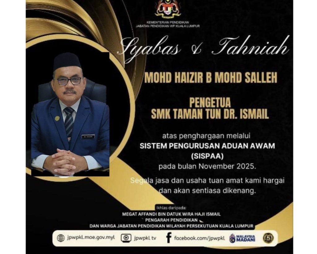 Syabas dan tahniah Tuan Mohd Haizir bin Mohd SallehDecember 11, 2025Written by itc Leave a Comment Syabas dan tahniah diucapkan kepada Tuan Mohd Haizir bin Mohd Salleh atas penghargaan melalui Sistem Pengurusan Aduan Awam (SISPAA) pada bulan November 2025. Segala jasa dan usaha Tuan amat dihargai dan akan sentiasa dikenang.