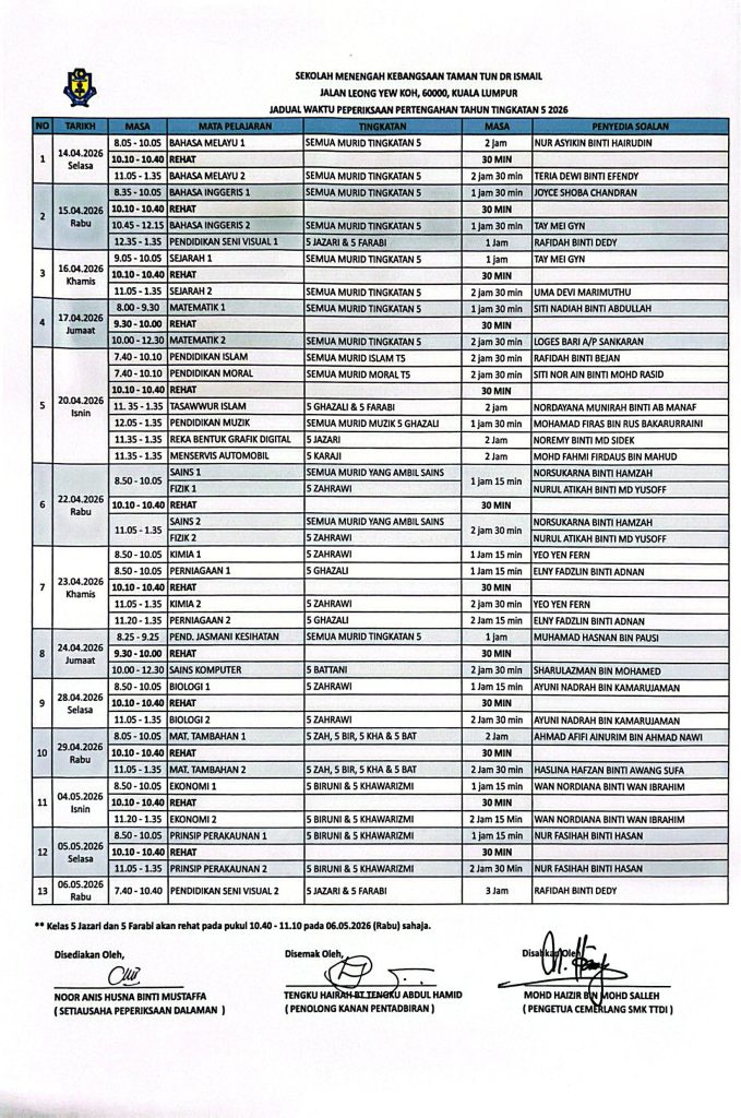 • Jadual Peperiksaan Pertengahan Tahun 2026 Tingkatan 5