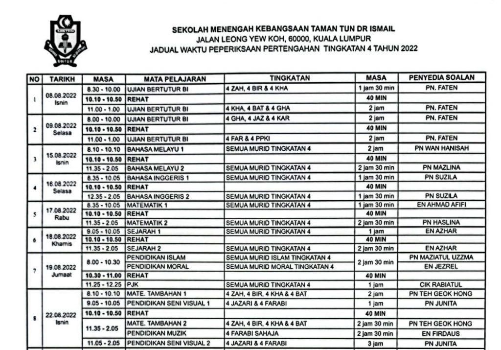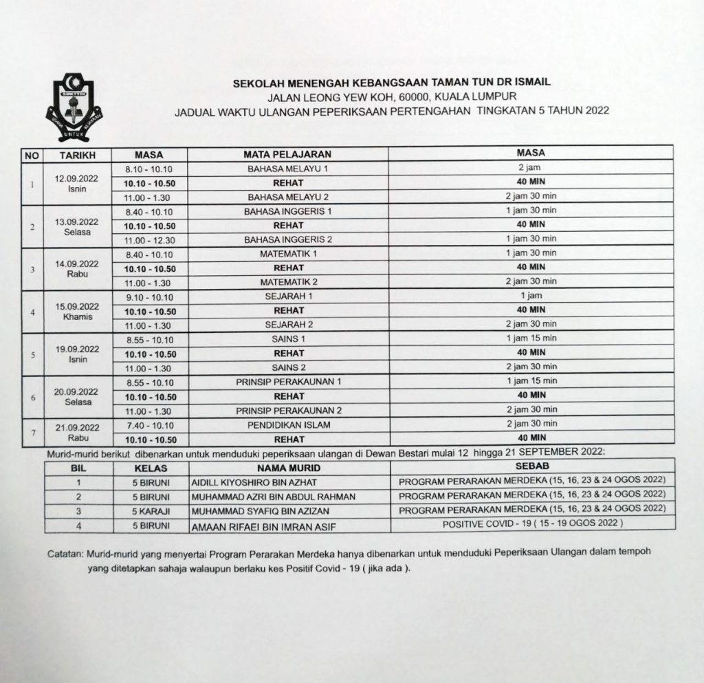 Makluman dan peringatan mesra kepada semua murid, Sepanjang minggu peperiksaan semua murid adalah diingatkan agar mematuhi perkara-perkara berikut: 1) Hadir awal ke sekolah2) Berpakaian seragam sekolah lengkap. Pakaian sukan/pj tidak dibenarkan.3) Penampilan yang kemas—>Lelaki – rambut pendek , kemas, tidak berfesyen—>Perempuan – bertudung atau rambut berikat kemas dan pin4) Tidak membawa barang larangan ke sekolah […]
