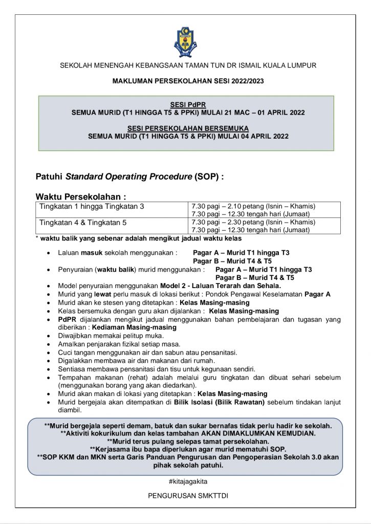 Makluman kepada ibubapa murid tingkatan 1 2022/2023Agihan buku teks akan dibuat pada 4 April 2022 semasa hari pertama persekolahan secara bersemuka. Jadual agihan akan di maklumkan oleh guru kelas pada hari tersebut. Semasa pdpr murid akan diberi pautan buku teks digital oleh guru kelas masing-masing.